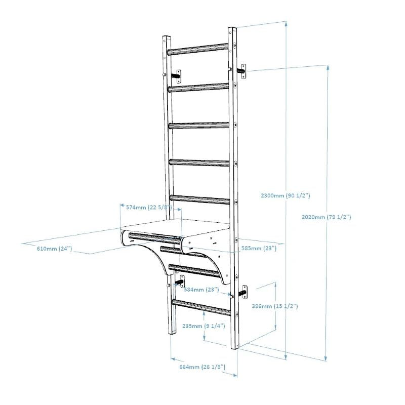 Dimensions: Wall bar width - 67 cm (26 ⅜″), Pull-up bar width - 56 cm (22 ⅛″), Height - 230 cm (90 ½″), Weight - 33 kg (72.6 lbs)
